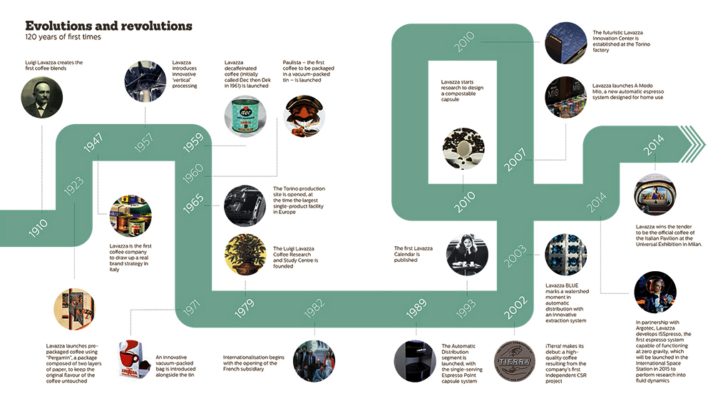120 years of inventions by the first branded packaging to the latest capsules coffee machine. Today, innovation continues, with special attention devoted to the world of away from home consumption: new roasting machines to ensure the aromatic excellence & new machines that allow preparing coffee with beans and capsule.